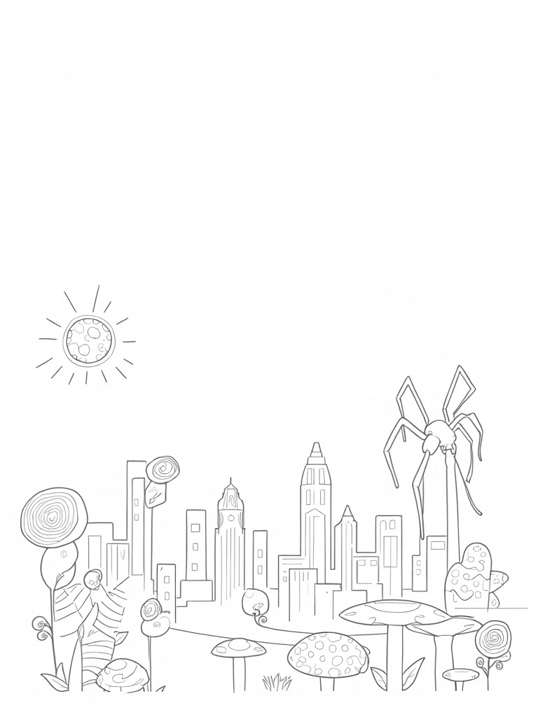 Check out this free, printable coloring page featuring a twisted urban skyline and a giant spider silhouette. Perfect for kids who love creating their own colorful worlds, this fun design is ready for some artistic flair!