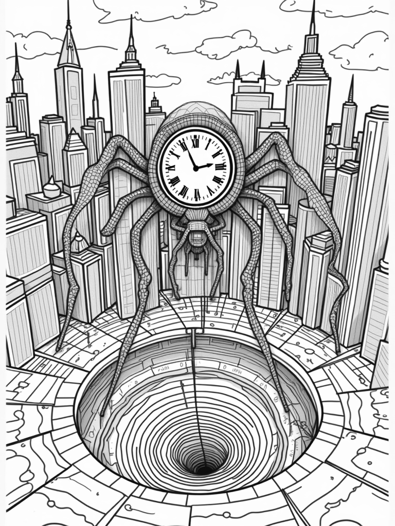 Twisted Skyscrapers and a Spider Clock in the City Coloring Page