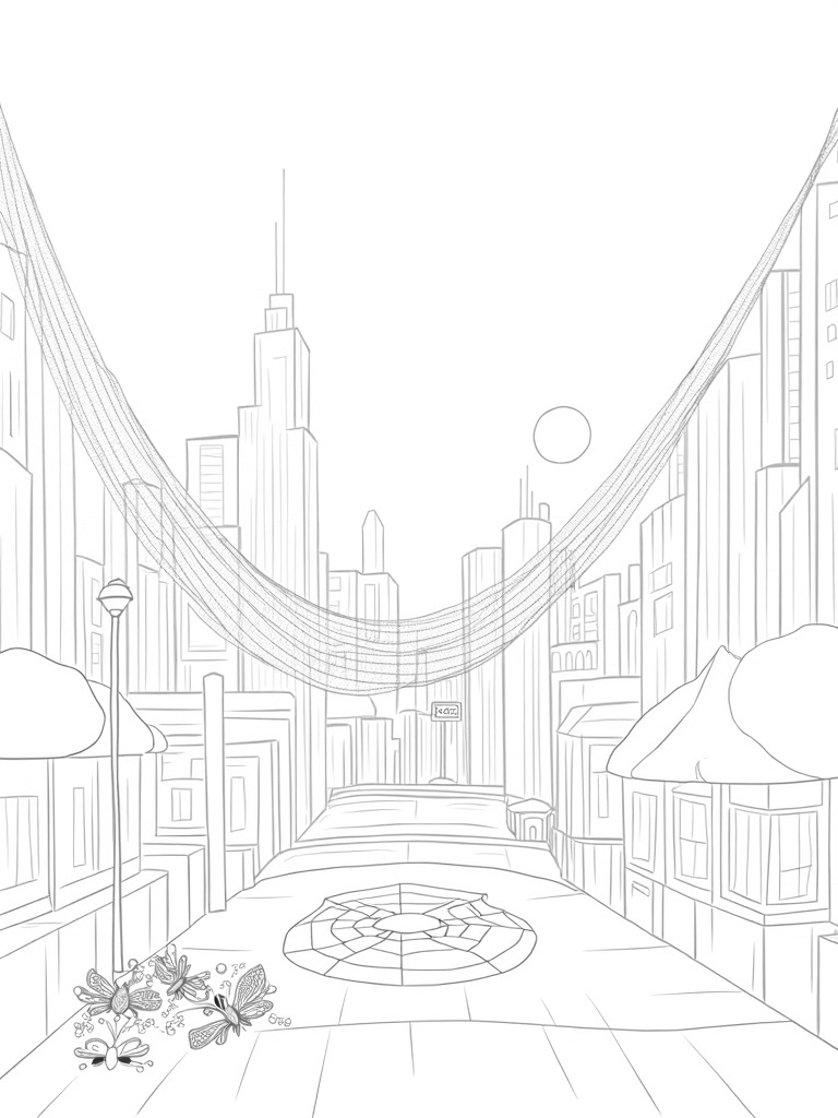 If you look down at the pavement, you’ll see a giant spider emblem surrounded by colorful tiles. It’s a fun detail that adds a splash of color to the scene. And don’t forget to admire the sunset in the background, with its vibrant shades of orange and purple casting dramatic shadows. It’s a perfect setting for a creative coloring session!