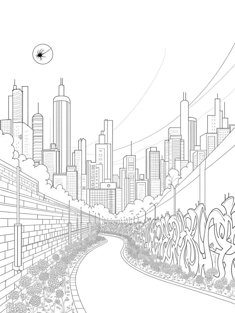 Get ready to color a bustling cityscape at dusk! Here, the skyscrapers aren’t just tall; they twist and curve like giant vines reaching for the stars. Between them, a massive web made of sparkling threads creates a cool pattern. Look down, and you’ll spot some oversized spider-shaped street lamps lighting up a winding path, which is surrounded by beautiful blooming flowers. It’s like a blend of nature and city life!
