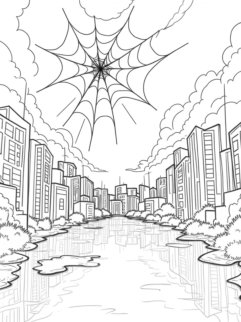 Imagine a city where the skyscrapers twist and curve like vines, creating an amazing skyline! You’ll see a huge, shiny spider web hanging between two buildings, glistening in the sunlight. Below, a puddle reflects the entire city, making it look like there are rooftops floating on clouds! To add a fun touch, oversized spider motifs peek from the windows, showing how nature can blend with the urban vibe.