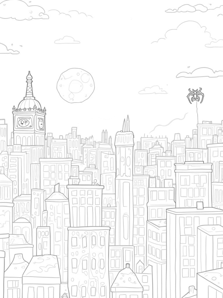 Urban Skyline Spider Webs at Dusk Coloring Page