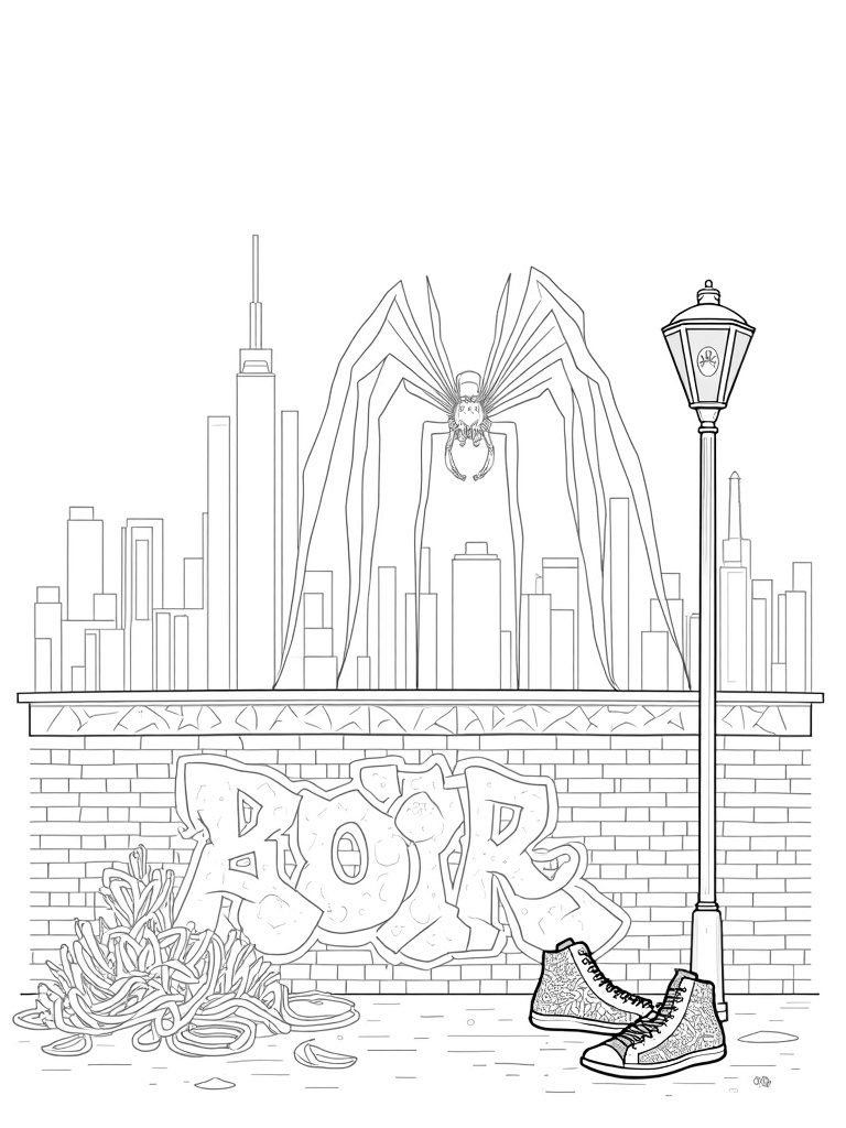 Urban Skyline with Giant Spider and Graffiti Coloring Page