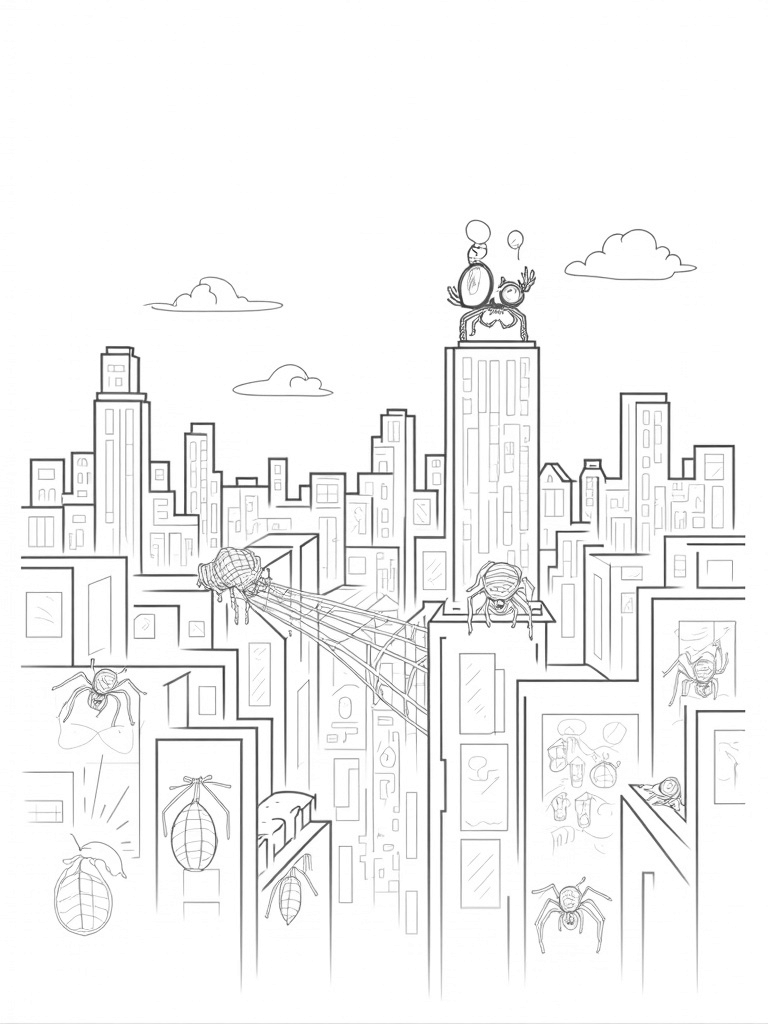 Urban Skyline with Giant Spider and Twisted Skyscrapers Coloring Page