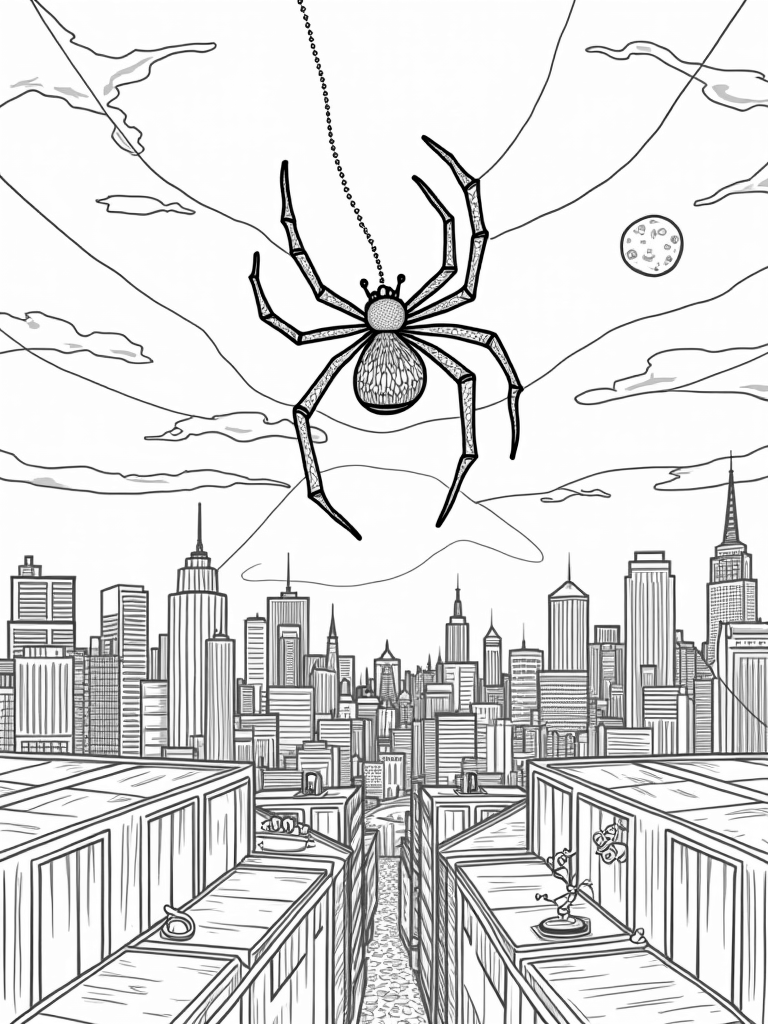 As the full moon casts its silver glow, it makes everything look even more magical. The moonlight creates a silhouette of the buildings, highlighting the delicate details of the web. It’s a perfect backdrop for some coloring fun, and you can bring this scene to life with your favorite colors!