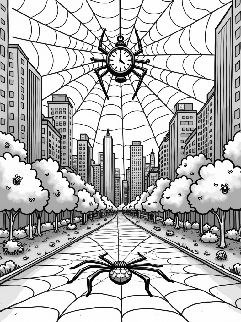 Imagine a bustling city filled with tall skyscrapers, all connected by giant, intricate spider webs! Right in the middle, there's a huge spider-shaped clock hanging between two buildings, its long legs stretching out like they’re ready to catch the time. Below, the city park is alive with oversized cartoon bugs like ladybugs and dragonflies, just chilling on giant leaves. It’s a fun and quirky scene that blends nature with city life!