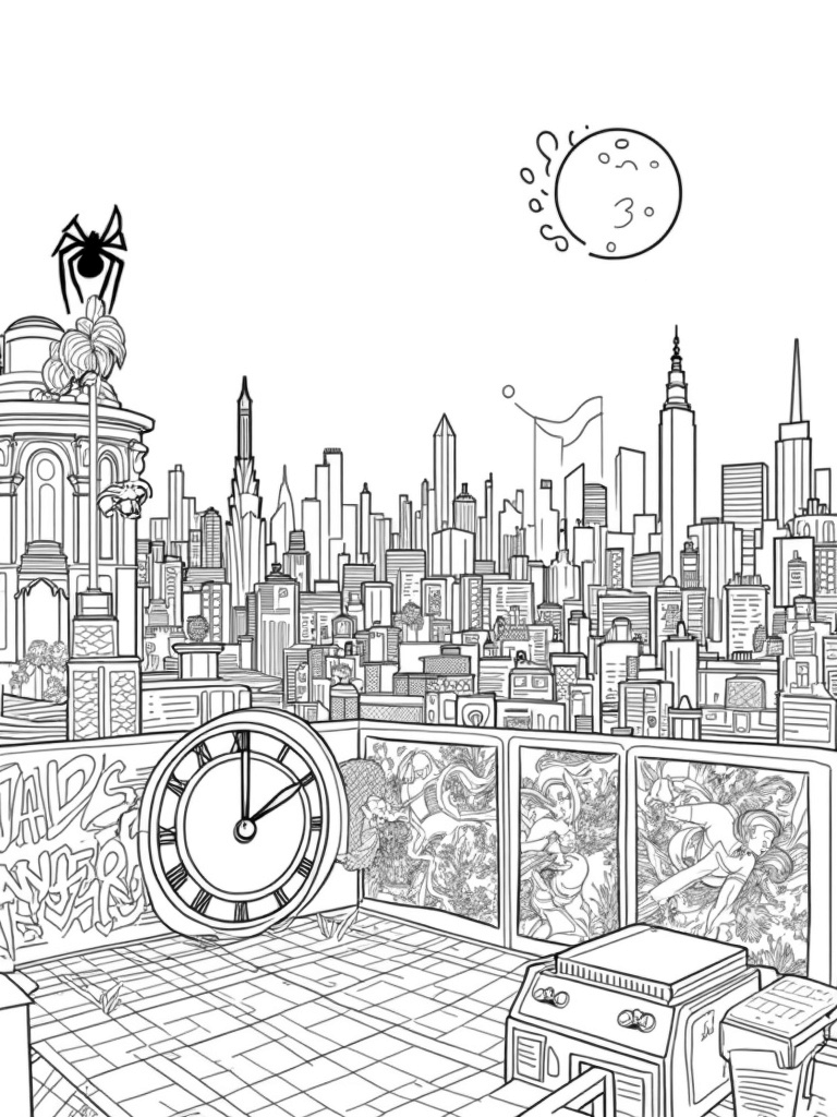 Urban Skyline with Spider Clock and Graffiti Coloring Page