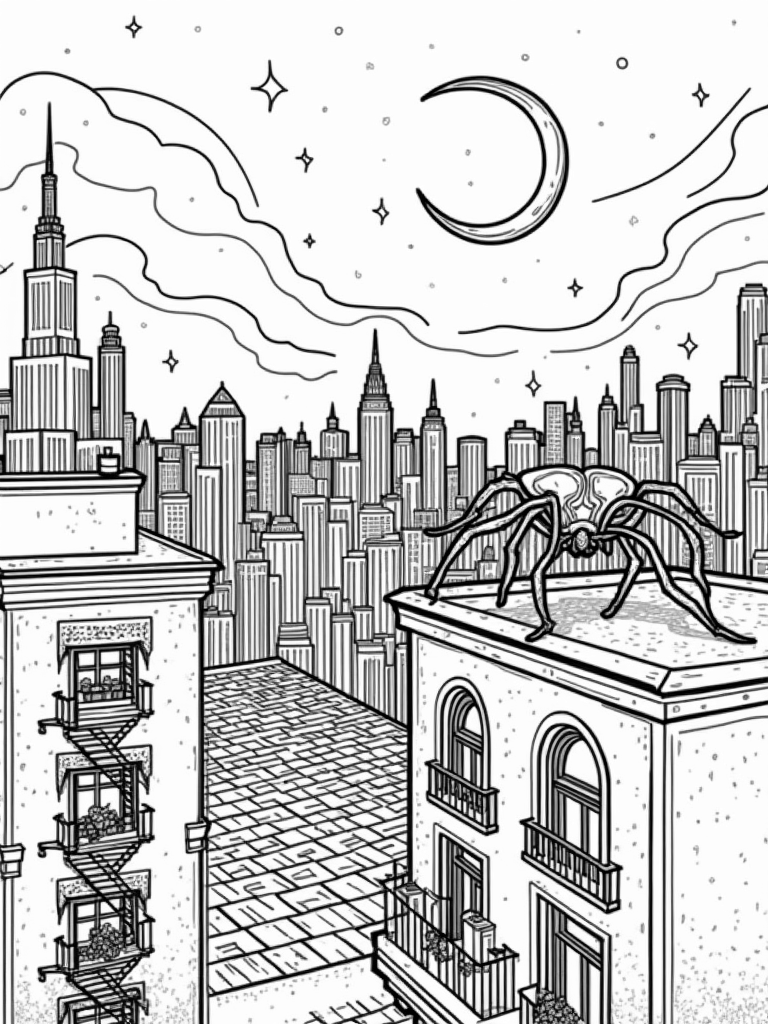 Urban Skyline with Spider Sculpture at Twilight Coloring Page