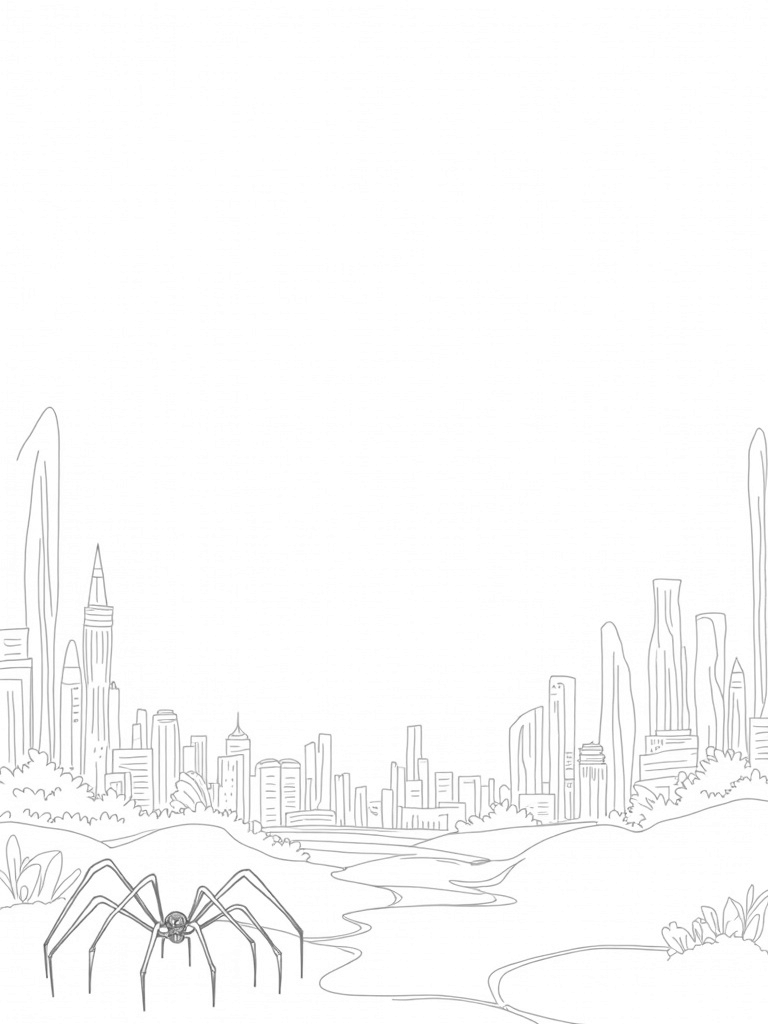 Urban Skyline with Spider Web and Colorful Park Coloring Page
