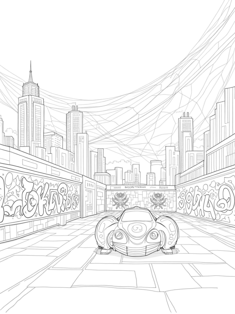 Check out the graffiti-covered walls nearby, adorned with spider motifs that add a fun edge to the scene. Plus, there’s a sleek, futuristic spider-shaped vehicle lounging on a rooftop, reflecting the vibrant lights of the city below. Don't forget to notice the oversized spider silhouettes casting dramatic shadows on the pavement, adding a little thrill to your coloring experience!