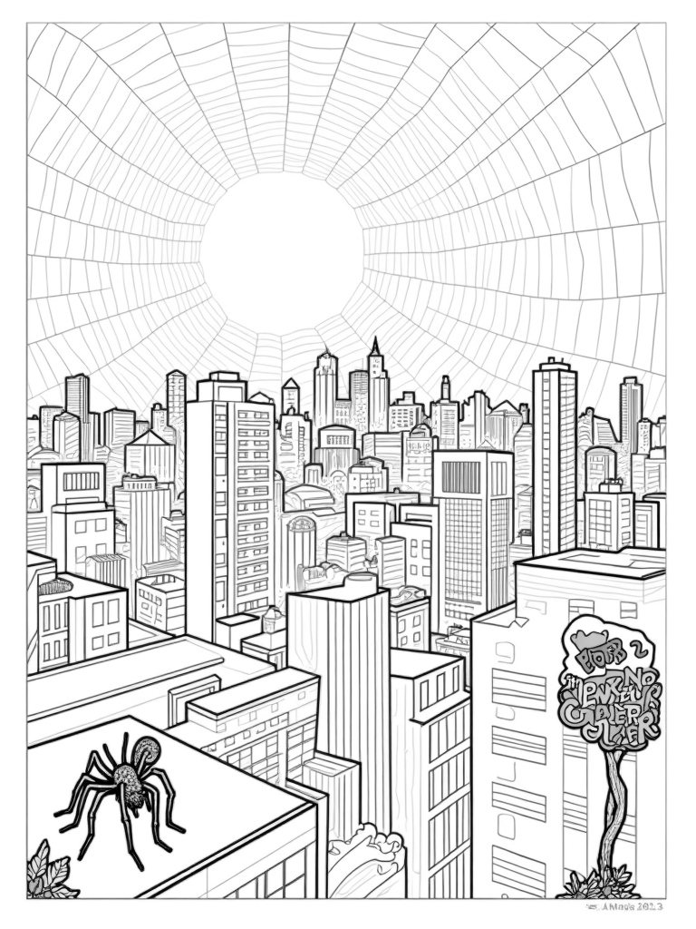 Look closely, and you’ll spot a giant, stylized spider silhouette perched on a rooftop. Its long legs extend out, seamlessly merging with the web below. Isn’t that a cool way to connect the city to its eight-legged friend? It adds a quirky touch to the skyline, making it even more fun to color!