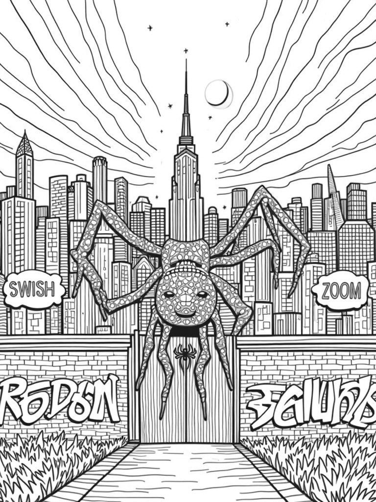 Check out this free, printable coloring page featuring an urban skyline with a giant spider and fun graffiti! Perfect for kids who love Spiderman and want to add their own colors to this cool scene.