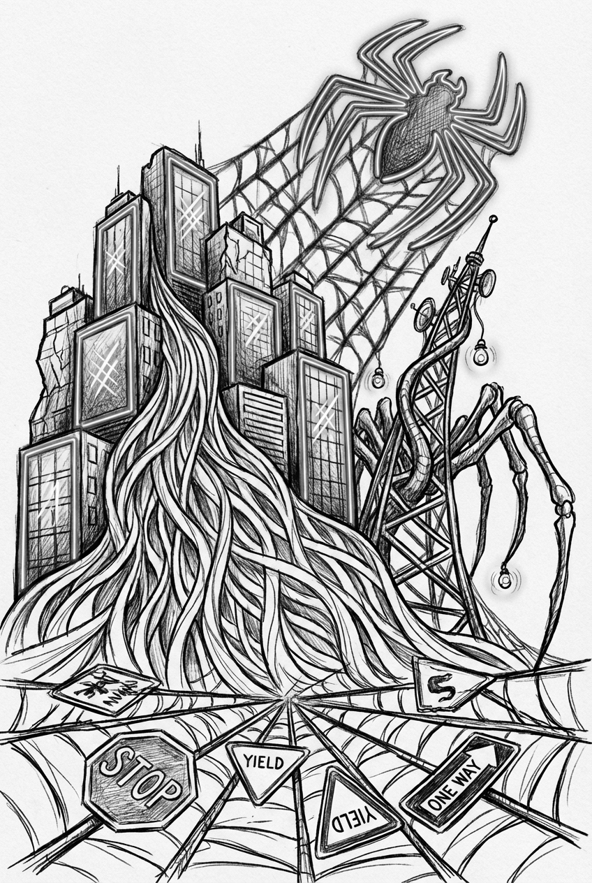 Picture a jagged skyline made of comic‑panel towers, each outlined in bold, hand‑drawn lines. From the tops, a massive web‑like waterfall pours down in silky ribbons that catch the light. Beside it, a radio mast twists like a spider’s leg, its antennae topped with tiny lantern‑eyes. Hovering above the roofs is a glowing neon spider emblem, throwing a lattice of shadows that weave right back into the falling web. On the ground, broken traffic signs have been turned into oversized web‑spokes, anchoring the whole scene.