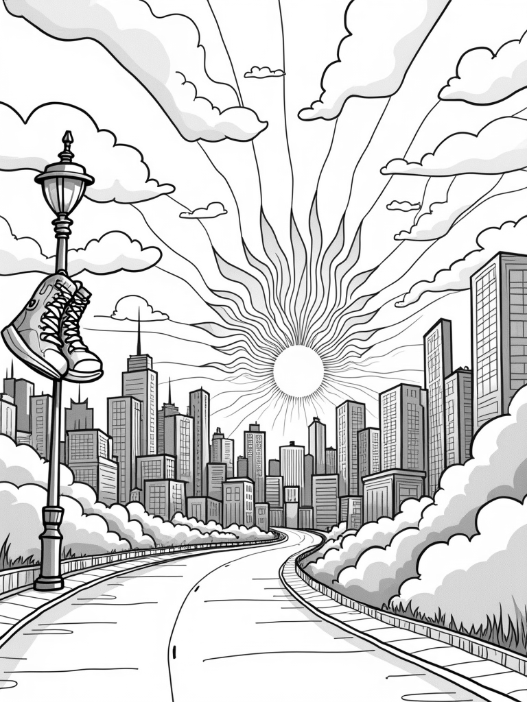 Whimsical City Skyline with Spider Symbol and Sneakers Coloring Page