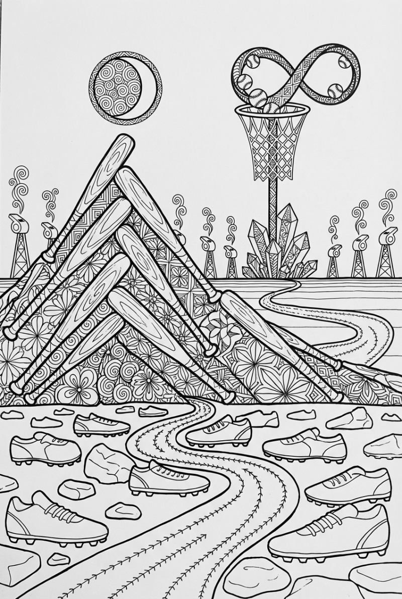When you bring this scene to life, think about the contrast between the smooth bat and the busy stitching river. You could give the baseball a glossy glow, or shade the cleats in bold reds and blues. The basketball hoop’s net works great for tiny zig‑zag patterns, and the soccer balls are perfect for swapping in your favorite team colors. The whistle towers can be filled with swirling lines that look like sound waves – a fun way to practice steady hand work. Because the line art is clean and spaced out, there’s plenty of room to experiment with different palettes while keeping the zentangle vibe.