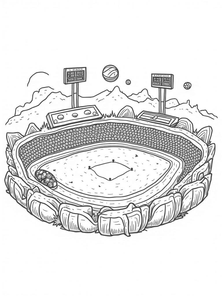 This coloring page showcases a unique sports arena shaped like a giant baseball glove, cradling a bright green field right in the middle. At each end, you’ll see towering goalposts made from intertwined tennis rackets, perfect for all your favorite sports. Floating above the scene are vibrant basketballs, giving the whole picture a fun, lively vibe.