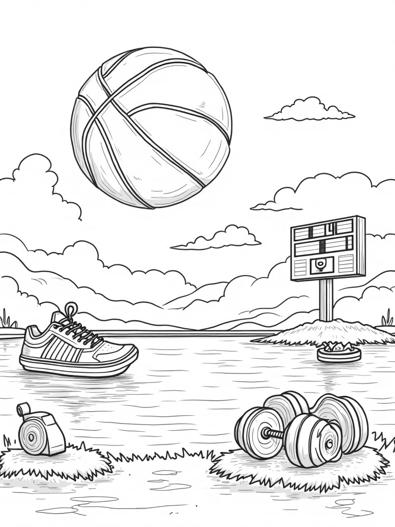 Basketball Above a Peaceful Lake with Sneaker Boats Coloring Page