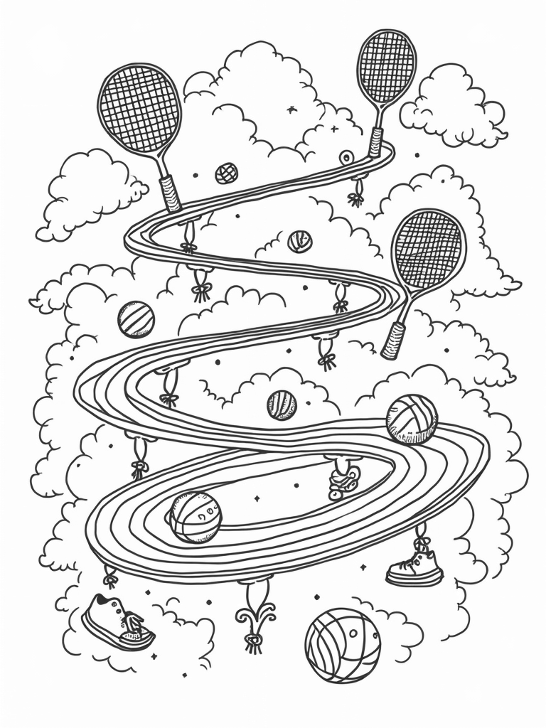 This coloring page shows a fantastic sports arena floating high in the clouds. Imagine oversized tennis rackets forming bridges between fluffy clouds, while below, a vibrant, spiraled track winds around platforms holding giant sports balls like basketballs, soccer balls, and volleyballs. At the center, a huge whistle hangs from a twisting vine, and oversized sneakers dangle from the cloud edges, ready for action!