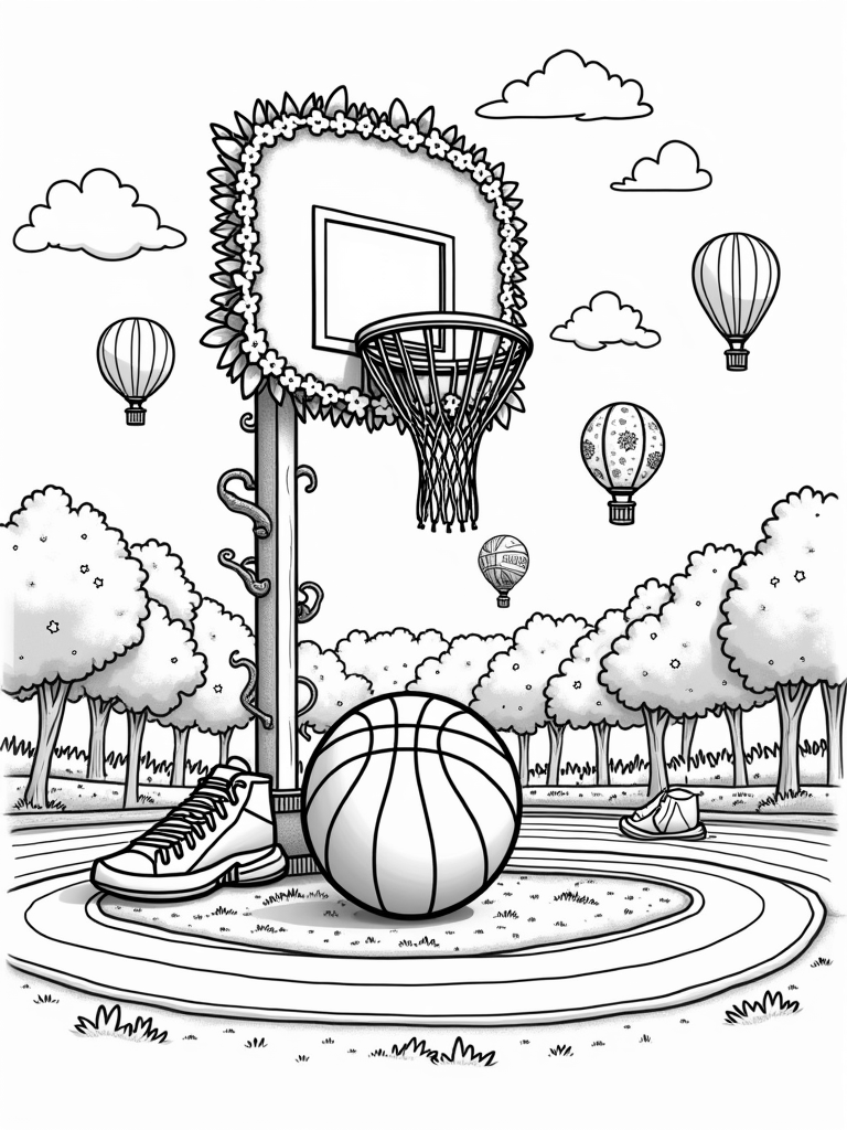 You’ll find a gigantic basketball hoop right in the heart of a lively urban park. The net isn’t just any net; it’s crafted from twisting vines and blooming flowers, making it feel like nature joined the game! Underneath, there’s a massive basketball with cool geometric designs just waiting for your favorite colors. And look around—oversized sneakers are floating above like hot air balloons, each one showing off different sports themes. It’s a fun, energetic scene!