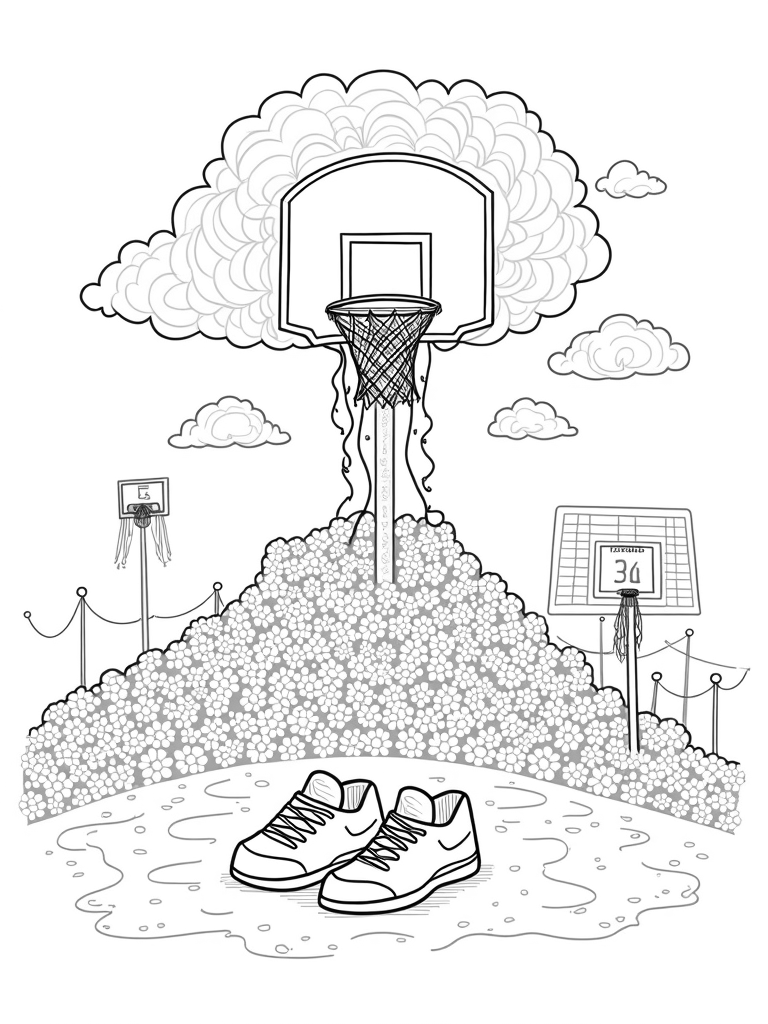 On one side of the hoop, a winding track made of checkered flags leads to a huge scoreboard, showing some quirky and abstract scores. It's a fun twist that adds an element of playfulness to the scene. And don’t miss the oversized sneakers sitting at the base of the hoop, with their laces flapping in the breeze like sails. What a fun way to get your creativity flowing!
