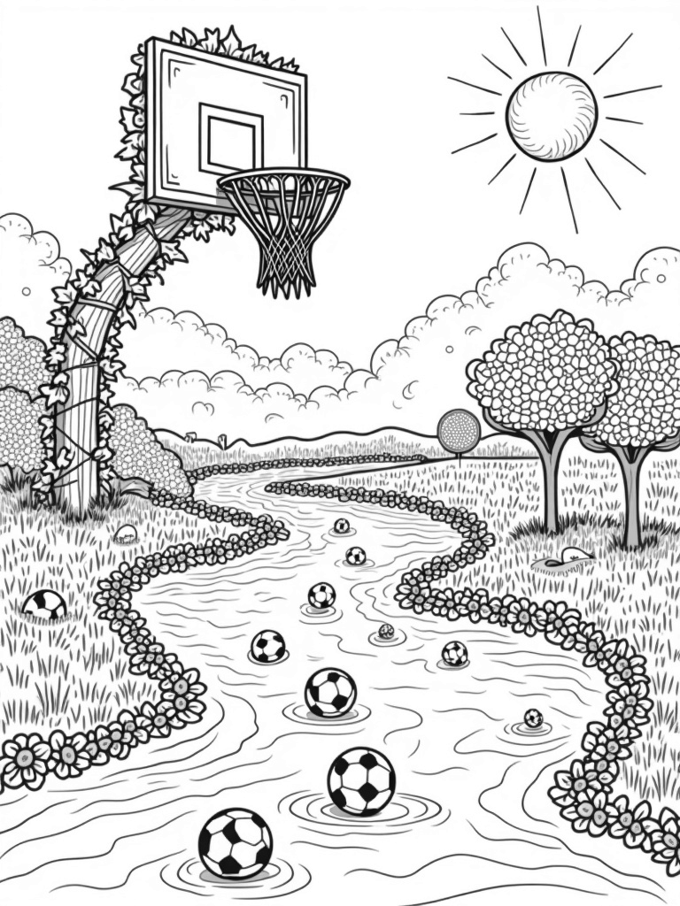 A gigantic basketball hoop towers over a rolling green field, making it look like a scene straight out of a kid's imagination. The hoop's net is uniquely crafted from vines and flowers, giving it a magical touch. Below, there's a winding river that sparkles like a game of soccer, with oversized soccer balls floating along the current. It’s a playful twist on sports!