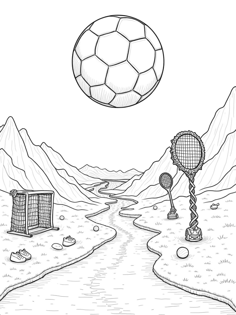 Check out this awesome scene where a gigantic soccer ball hovers above rolling grassy hills! Below it, a winding river flows like a fun racetrack, lined with funny oversized sneakers and whistles, making it feel like a sports wonderland. On one side, there’s a cool goalpost made of twisting vines, all decked out with colorful ribbons that are just waiting to be colored in!