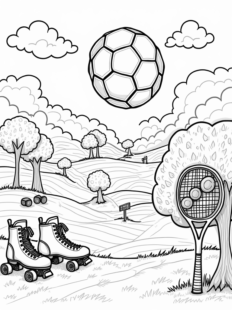 On a grassy hill nearby, a pair of roller skates are resting, and they’ve got vibrant ribbons streaming from their laces, adding a splash of color to the scene. And right up front, a huge tennis racket leans against a tree. The fruit on that tree looks just like bright yellow tennis balls—how cool is that?