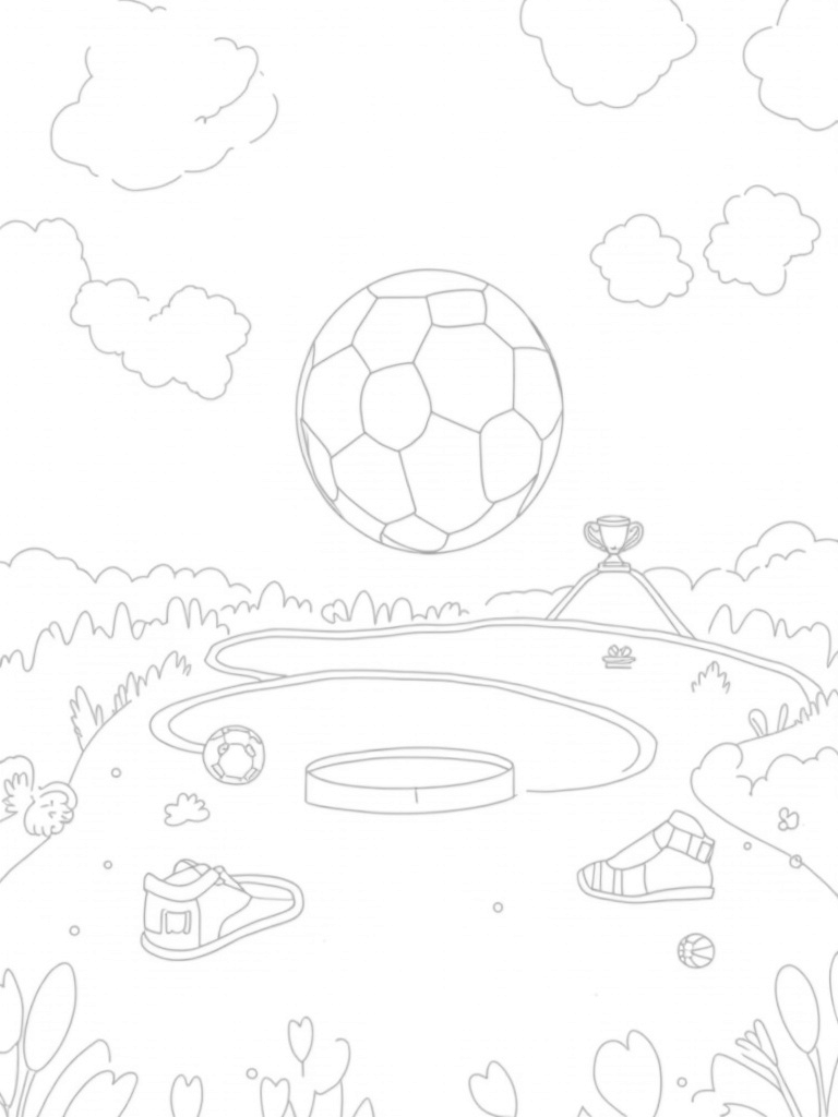 In the center of a vibrant green field, a gigantic soccer ball floats, inviting young sports fans to grab their crayons! Surrounding this impressive ball are oversized flowers shaped like trophies, adding a fun touch to the scene. Nearby, a colorful rubber track winds around small hills, making it the perfect path for little feet.