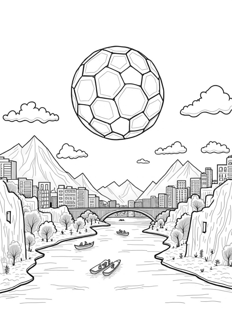Imagine a giant soccer ball floating high above a colorful city! Its shiny hexagonal panels reflect the bustling skyline below. A winding river flows through the streets, with kayaks and paddleboards gliding along, making it perfect for a sunny day on the water.