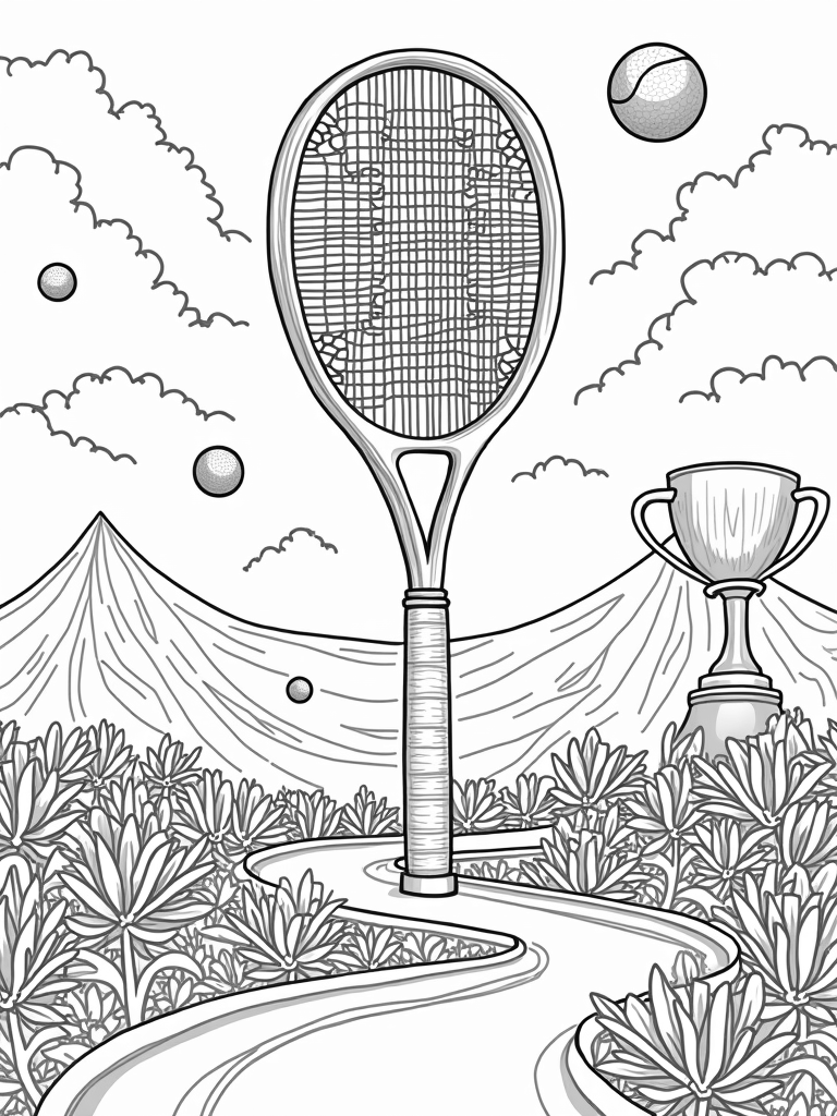 Colossal Tennis Racket with Floating Balls and a Trophy Coloring Page