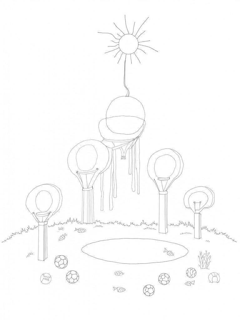 Imagine a giant basketball hoop swirling above a bright green field, its net cascading down like a magical waterfall! Beneath it, oversized tennis rackets create a fun archway, perfectly framing a peaceful pond where colorful fish leap joyfully through the air. Scattered across the grass, you’ll find big, geometric soccer balls that act like stepping stones, guiding you to a towering football helmet sitting proudly on a pedestal.