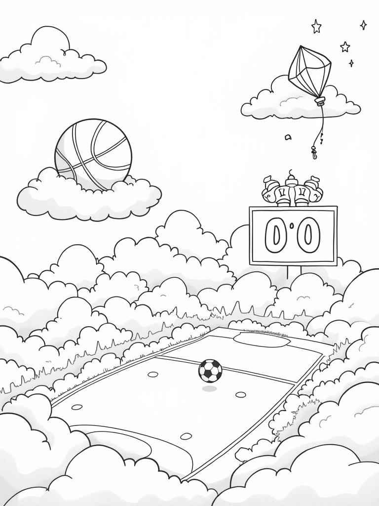 If you look closely, you’ll see a sparkling scoreboard made of stars, glowing against a beautiful twilight sky. It’s counting up to a whimsical zero, reminding us that sometimes, it’s just about having fun! This page is perfect for kids who love sports and want to let their creativity run wild with colors.