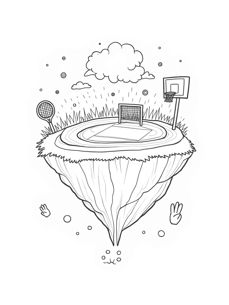 Check out this free, printable coloring page featuring a floating island shaped like a soccer ball, complete with colorful goalposts, tennis rackets, and a giant basketball hoop. Perfect for sporty kids who love to color!