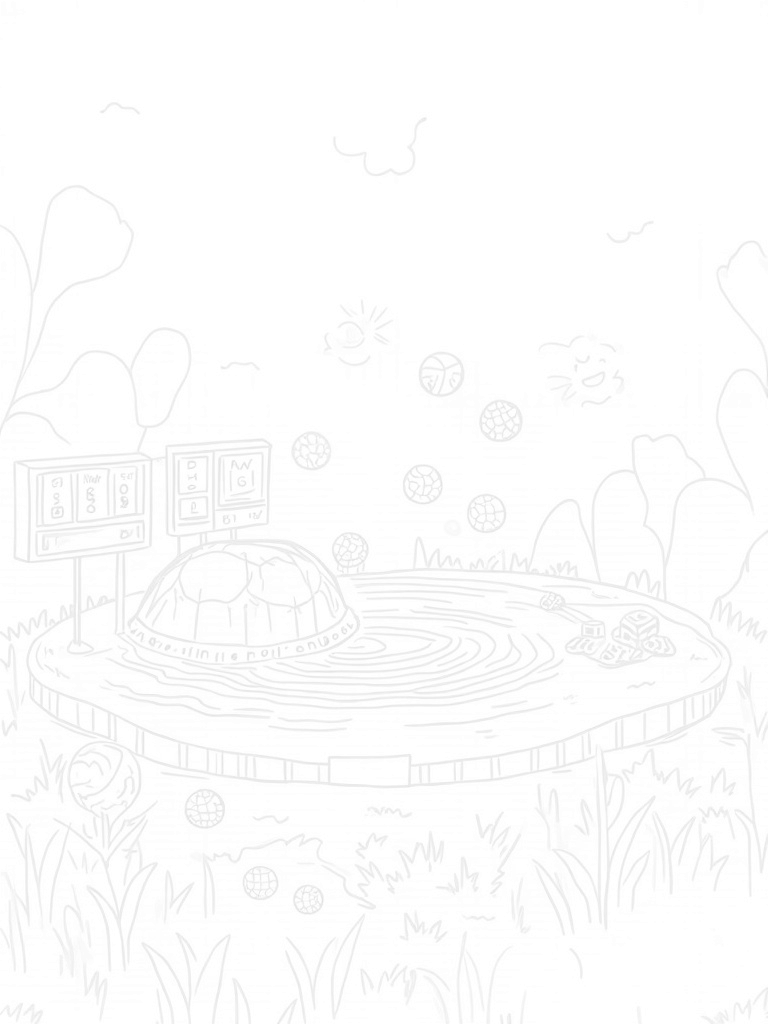Imagine a huge soccer ball floating in the sky, casting its shadow over a calm lake below. Beneath it, a whirlpool spins and creates waves that look just like a basketball bouncing! All around the lake, there's tall grass framing the scene, and you can spot oversized tennis rackets standing like friendly trees. In the foreground, a colorful scoreboard made of blocks shows some silly scores, while a bunch of giant baseballs hover above, each covered in fun, intricate designs just waiting for your colors.