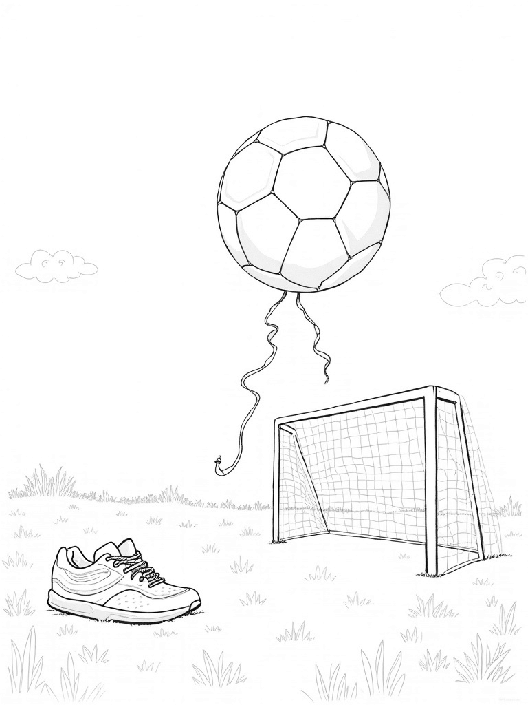 In this fun and imaginative drawing, a colossal soccer ball floats high above a lush green field, held down by colorful ribbons of grass. It’s not just any soccer ball; it’s huge and seems to bounce with excitement! Below it, oversized sneakers rest on the turf, each one boasting swirling patterns and fancy laces that twist like vines. They look like they’re ready to spring into action!