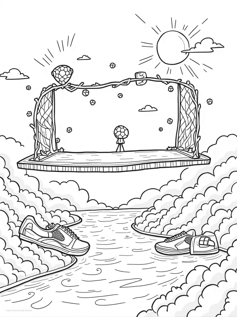 Imagine a soccer field just hanging out in the sky! This floating soccer field is surrounded by soft, fluffy clouds, making it look like something right out of a dream. Oversized soccer balls are bouncing around, just waiting for you to color them in. Above it all, a unique goalpost made from vines adds a fun twist to the game.