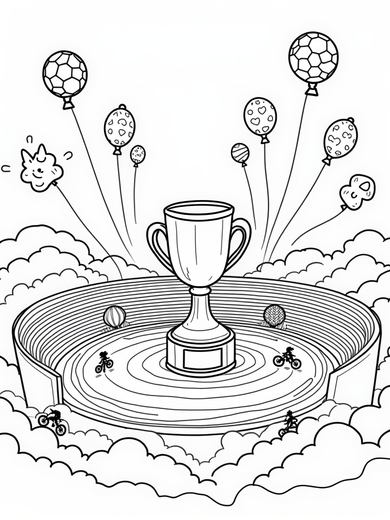 Imagine a sports arena high up in the clouds, where everything is vibrant and playful! In the center, a huge, colorful trophy shines brightly atop a pedestal shaped like stars and hearts. Around it, a spiral racetrack weaves its way, with little bicycles and skateboards racing for glory. And look up! Floating soccer balls and basketballs are cheerfully drifting like balloons, tied to oversized, happy whistles.
