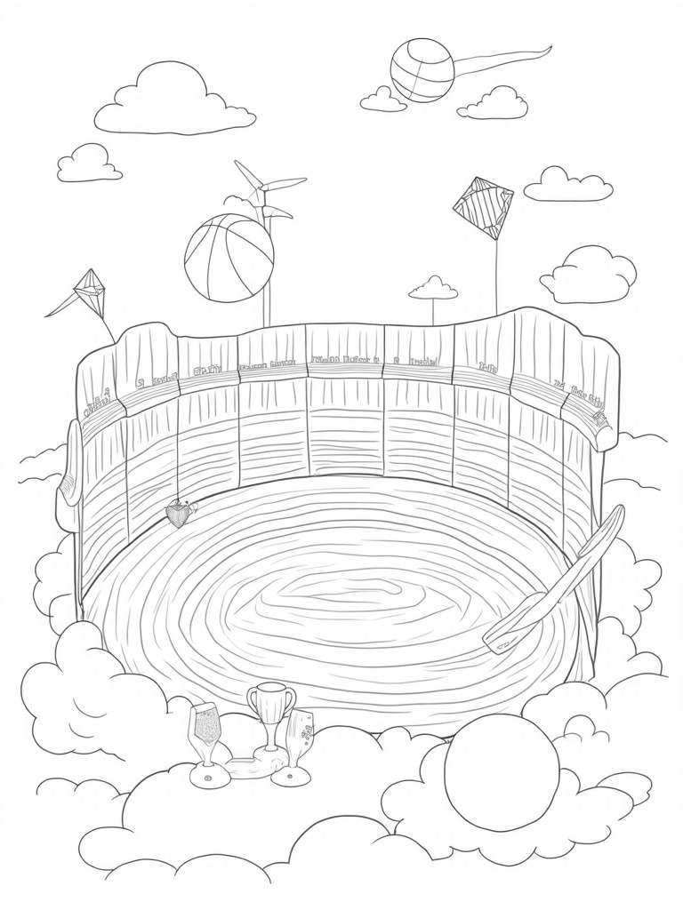 Check out this free, printable coloring page featuring a floating sports arena in the clouds! With giant basketball seats, colorful ribbon tracks, and playful kites, it's perfect for sports lovers and young artists alike.