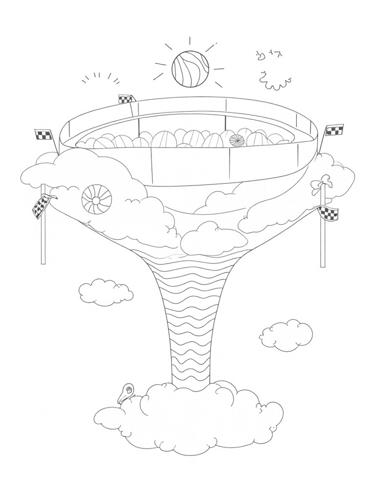 This coloring page shows a super fun sports arena that's up in the clouds! Picture giant basketballs floating like islands surrounded by fluffy white clouds. Below, there's a colorful swirling track that spirals down into a funky funnel, complete with big checkered flags waving in the air. At one end, a huge whistle hangs from a giant string, just waiting for the next game to start!