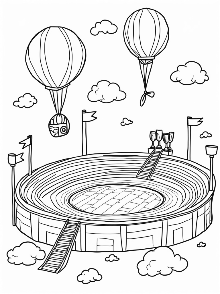 In one corner, there’s a winding track that spirals up like a staircase, leading to a podium made of shiny trophies. It’s the perfect spot for winners to stand tall! Ribbons and banners are fluttering in the wind, adding a festive vibe to the whole scene. It’s a place where fun and sportsmanship collide in the most colorful way!