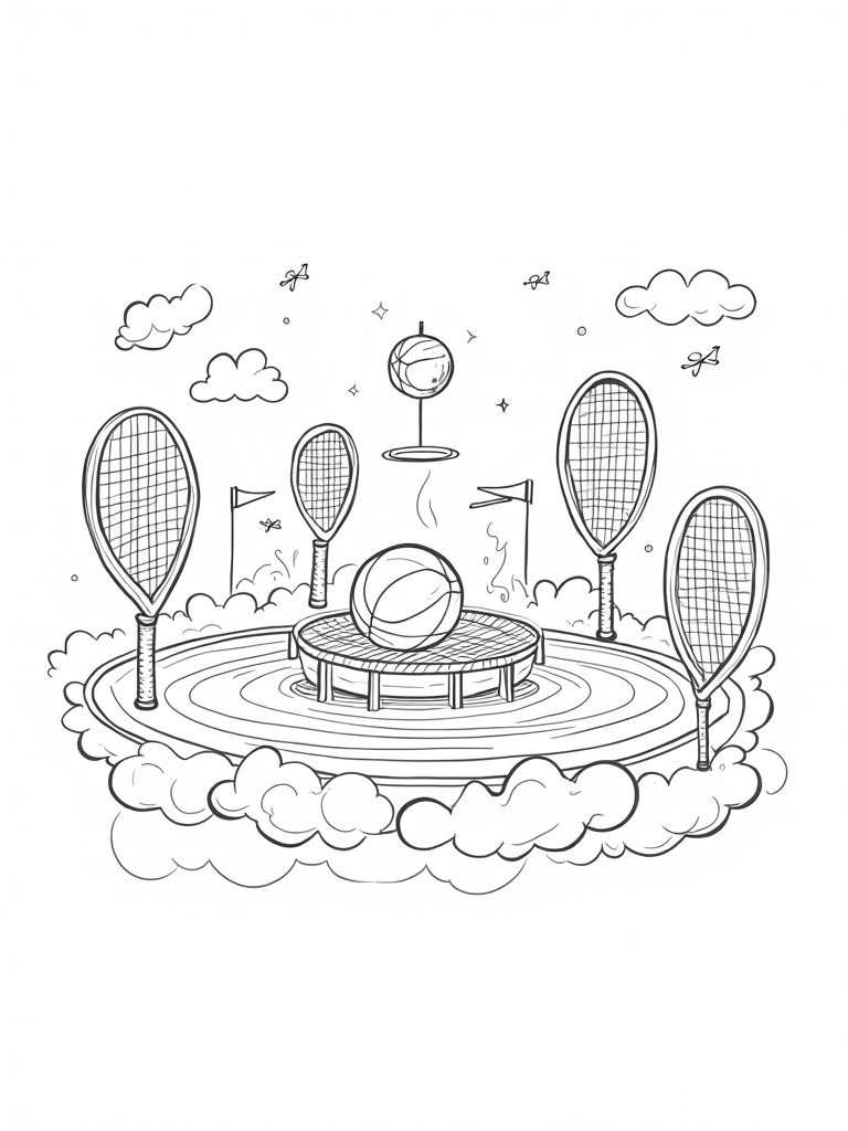Imagine a sports arena high above the ground, surrounded by fluffy clouds! The boundary is formed by oversized tennis rackets, creating a unique space for fun. In the center, a giant basketball is bouncing away on a trampoline made of colorful swirling ribbons, making it look like it’s dancing in the sky!