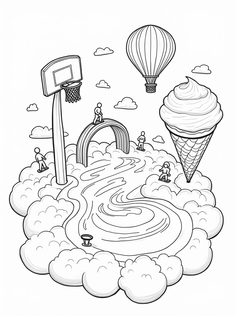 Look at this amazing sports arena floating high in the clouds! You’ll find a gigantic basketball hoop arching over a fluffy cotton candy hill, just waiting for a colorful ball to swoosh through. And check out that enormous soccer ball, it’s practically a hot air balloon drifting by! There’s even a winding track made of vibrant ribbons that spirals around a towering ice cream cone. Tiny skateboards and frisbees are resting at its base, ready for some fun!