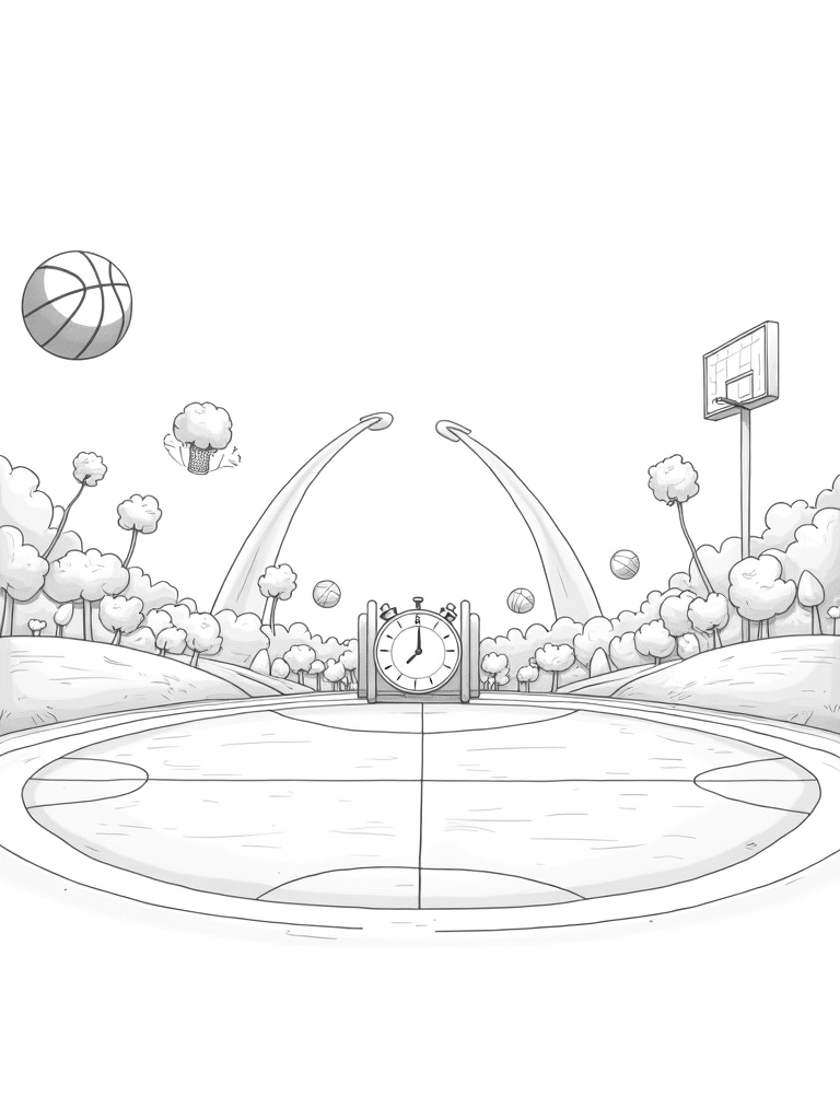 This scene captures a sports arena where everything is larger than life! Imagine a giant basketball that bounces just above your head, casting playful shadows on the ground. Nearby, a colossal soccer ball acts like a hill, and it’s surrounded by quirky trees shaped like goalposts. In the center, a swirling track wraps around a massive stopwatch, its hands spinning endlessly. Colorful streamers dance in the air, making the whole place feel alive!