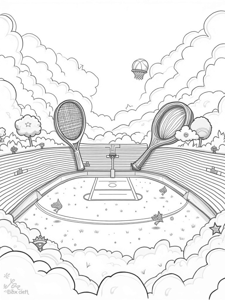 This free, printable coloring page features a floating sports arena with giant inflatable balls and cheerful clouds. Perfect for kids who love sports and fun scenes, it's a great way to spark creativity during coloring time.