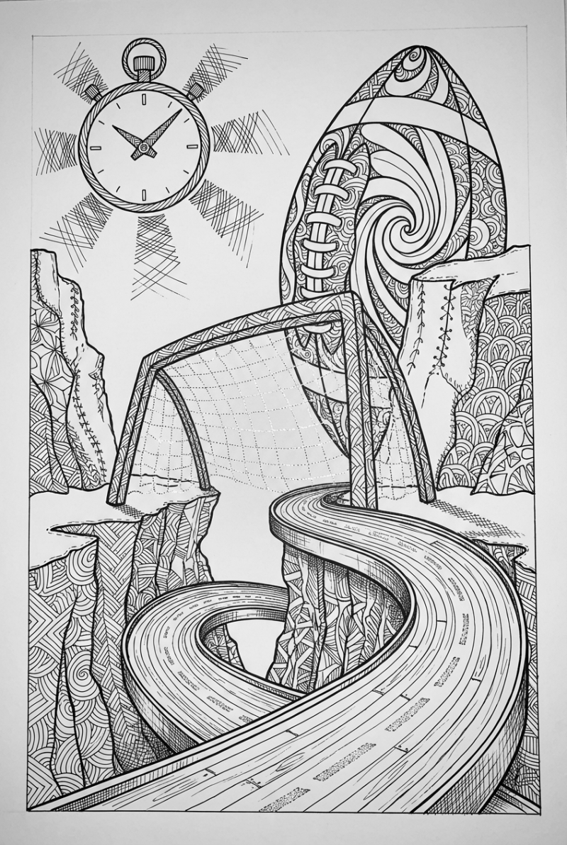 Imagine a huge football that suddenly turns into a canyon made of stitched leather cliffs. Right in the middle, a giant goalpost stretches across like a bridge, its net sparkling with imagined glowing threads. Wrapped around the canyon walls is a polished wooden track that spirals like a ribbon, each lane marked with twinkling lane lines. Hovering above everything is a floating stopwatch, acting like a little sun, its hands casting playful shadows on the scene. All of this is drawn in crisp black‑ink zentangle style, with clean patterns and plenty of whitespace for easy coloring.