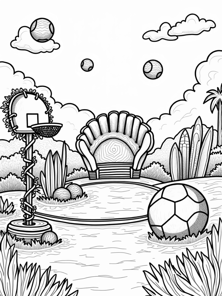 Check out this free, printable coloring page featuring a giant baseball glove sports arena! It’s packed with fun elements like a basketball hoop, surfboards, and oversized tennis balls, perfect for kids who love sports and creativity.