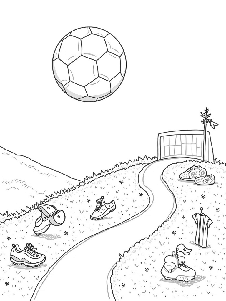 If you look closely, you'll see a giant soccer ball floating above a beautiful, rolling hill. It's casting a playful shadow on a winding track below, where oversized sneakers are scattered about. Each sneaker has its own unique patterns of laces and soles, just waiting for some creative colors!