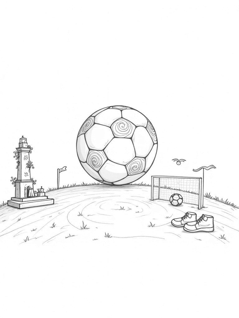 A colossal soccer ball is floating above a grassy hill, looking like something straight out of a daydream! Its panels are decorated with swirling patterns that almost seem to dance in the breeze. Just next to it, there's a giant whistle standing tall, covered in vines as if nature decided to join the game. Scattered around are oversized sneakers, each with their own funky designs, waiting for little feet to step into them.