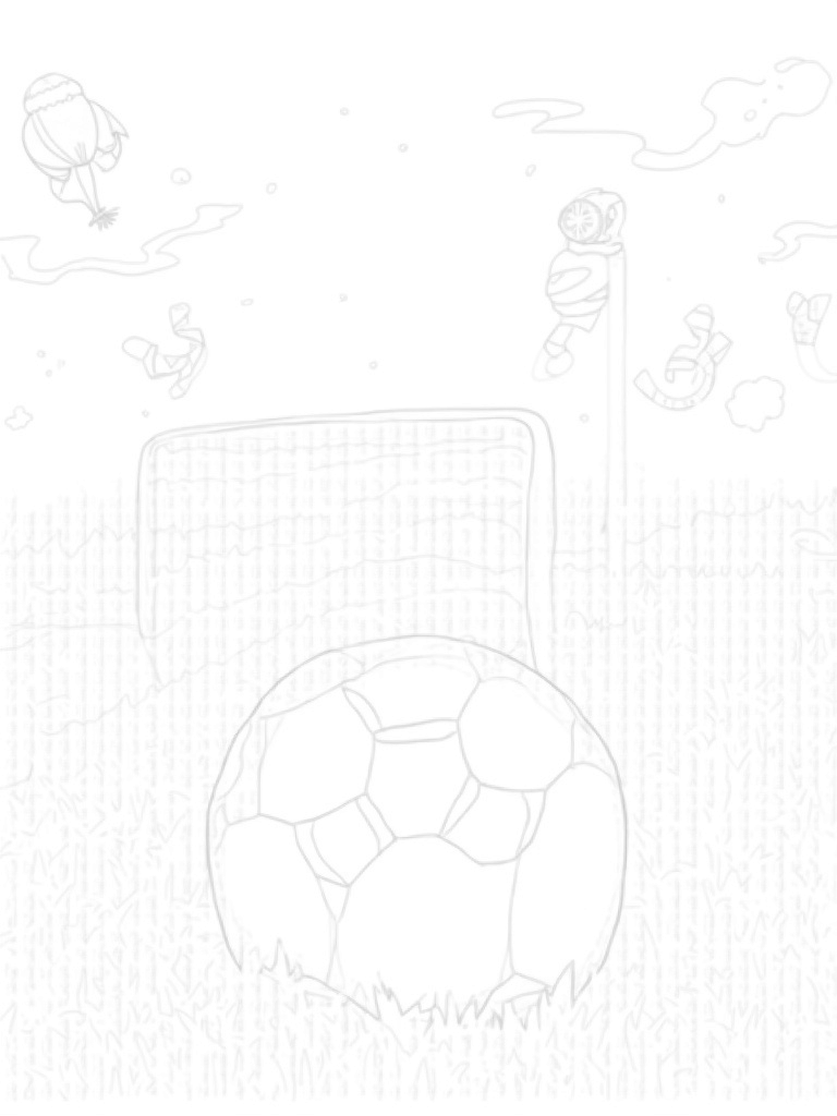 In this fun coloring page, a giant soccer ball takes center stage in a lively grassy arena. It's surrounded by goalposts that twist and turn like trees, giving it a magical feel. Above, colorful ribbons swirl around, evoking the playful movement of a kite, while oversized sneakers float in the air, adding to the whimsical vibe.