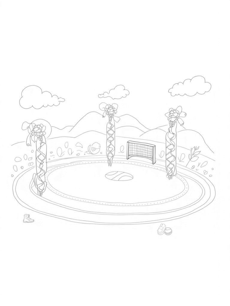 This scene is all about fun and sports! Imagine a huge soccer ball sitting in a beautiful landscape, surrounded by rolling hills. On either side, there are tall goalposts made from twisting vines, decorated with colorful ribbons that flutter in the breeze. A vibrant rainbow track winds around the ball, inviting everyone to join the excitement.
